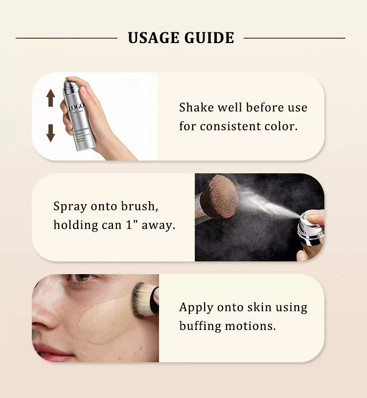 Agitați bine cutia cu spray înainte de utilizare, pentru a vă asigura că formula de spray pentru fondul de ten pentru menținerea machiajului pentru păstrarea culorii este amestecată uniform. Țineți recipientul la aproximativ 15-20 de centimetri distanță de față și pulverizați uniform pe pielea curată și uscată, evitând zonele ochilor, nasului și gurii. După pulverizare, tamponați ușor cu vârful degetelor sau lăsați să se usuce în mod natural pentru ca fondul de ten să adere uniform pe piele, creând un finisaj ușor și natural. Pentru o acoperire îmbunătățită sau rezultate de durată, reaplicați după cum este necesar. Asigurați o ventilație adecvată în timpul utilizării și evitați inhalarea spray-ului.