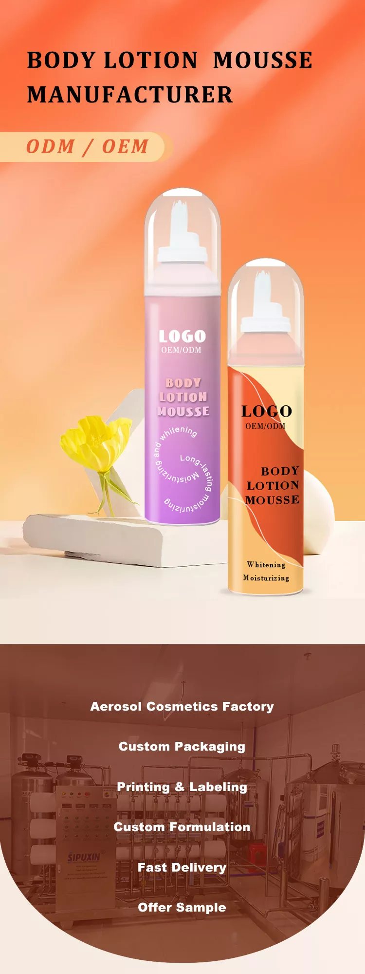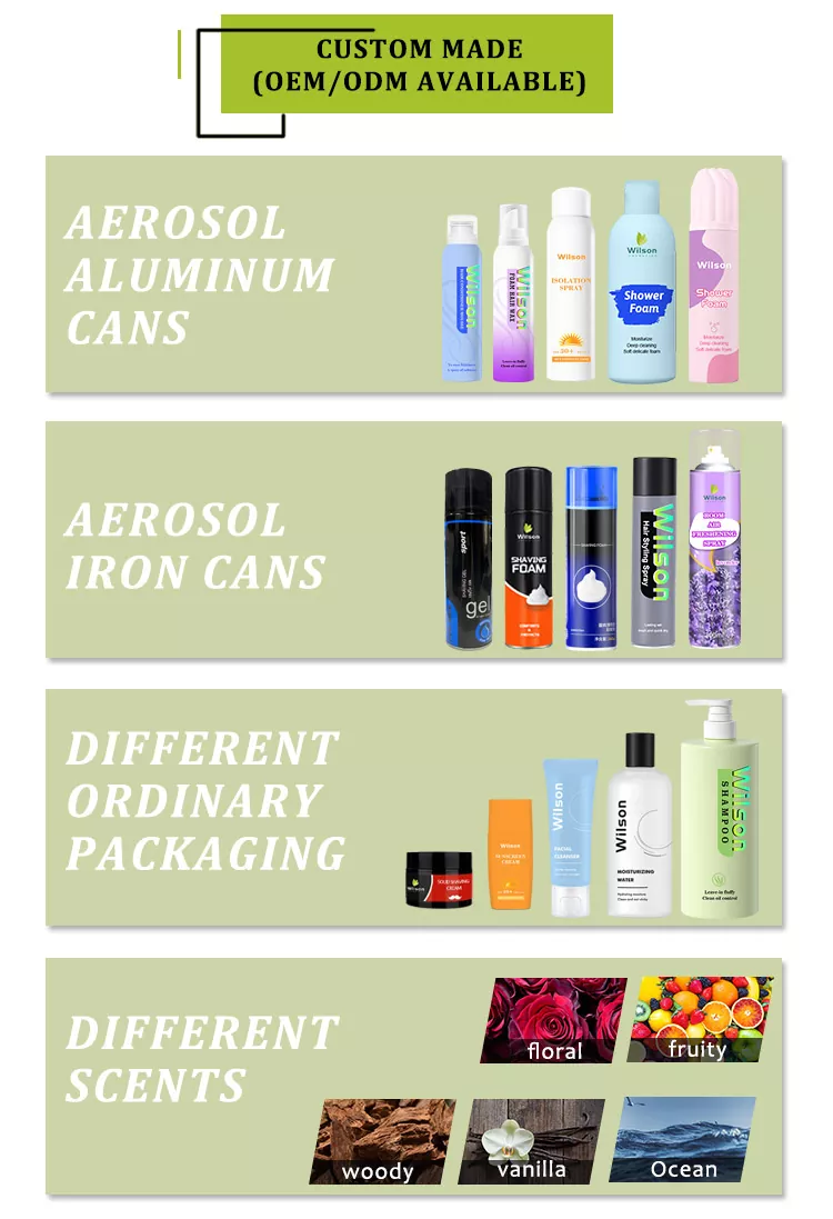 Wilson Quick Absorption Lightweight Texture Body Lotion Mousse este o crema hidratanta de lunga durata care poate fi absorbita in corp. Spuma noastră vine sub formă de aerosoli într-o cutie de aluminiu, care produce o spumă bogată atunci când este presată. În comparație cu senzația grea și lipicioasă a loțiunilor tradiționale, spuma noastră de corp aduce o atingere ușoară, ca un nor de moale și dens. În plus, avem o varietate de formulări din care să alegeți, de exemplu, puteți adăuga la formula extracte hidratante extrem de eficiente, cum ar fi acid hialuronic multiplu, extracte naturale din plante etc., care pot face ca microstructura spumei să fie mai propice compoziției ingredientelor direct sub piele, astfel încât să aibă o hidratare intensivă și un efect de hidratare de blocare, de lungă durată asupra pielii. Pielea este hidratată din interior spre exterior.