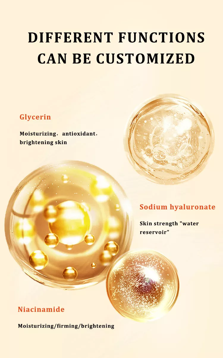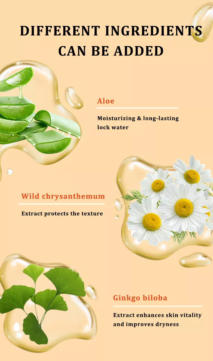 De asemenea, putem personaliza formula dorită în funcție de ingredientele specifice ale produsului (de exemplu, acid hialuronic principal, niacinamidă, vitamina E, extracte specifice din plante etc.), parfum (de exemplu, trandafir, ceai alb, neparfumat etc.) și dacă are efecte speciale (de exemplu, reparație puternică, albire, fermitate etc.).